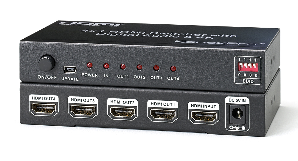 The KanexPro 1x4 HDMI Splitter is a 4K@30Hz compliant distribution amplifier which lets you duplicate one HDMI source to 2 displays without losing signal integrity and resolution.